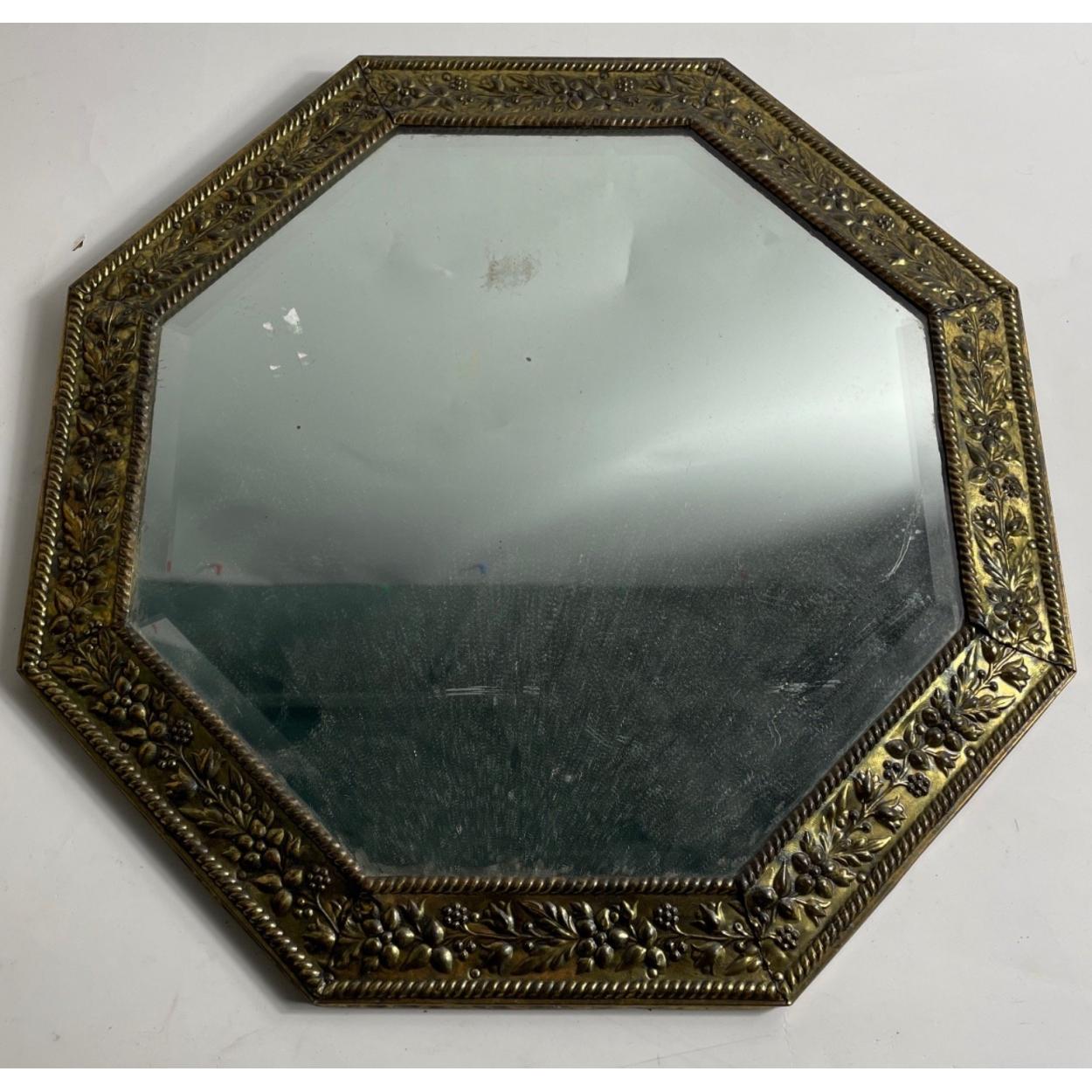 OCTAGONAL flower embossed metal framed bevelled mirror 43cm diam. approx.