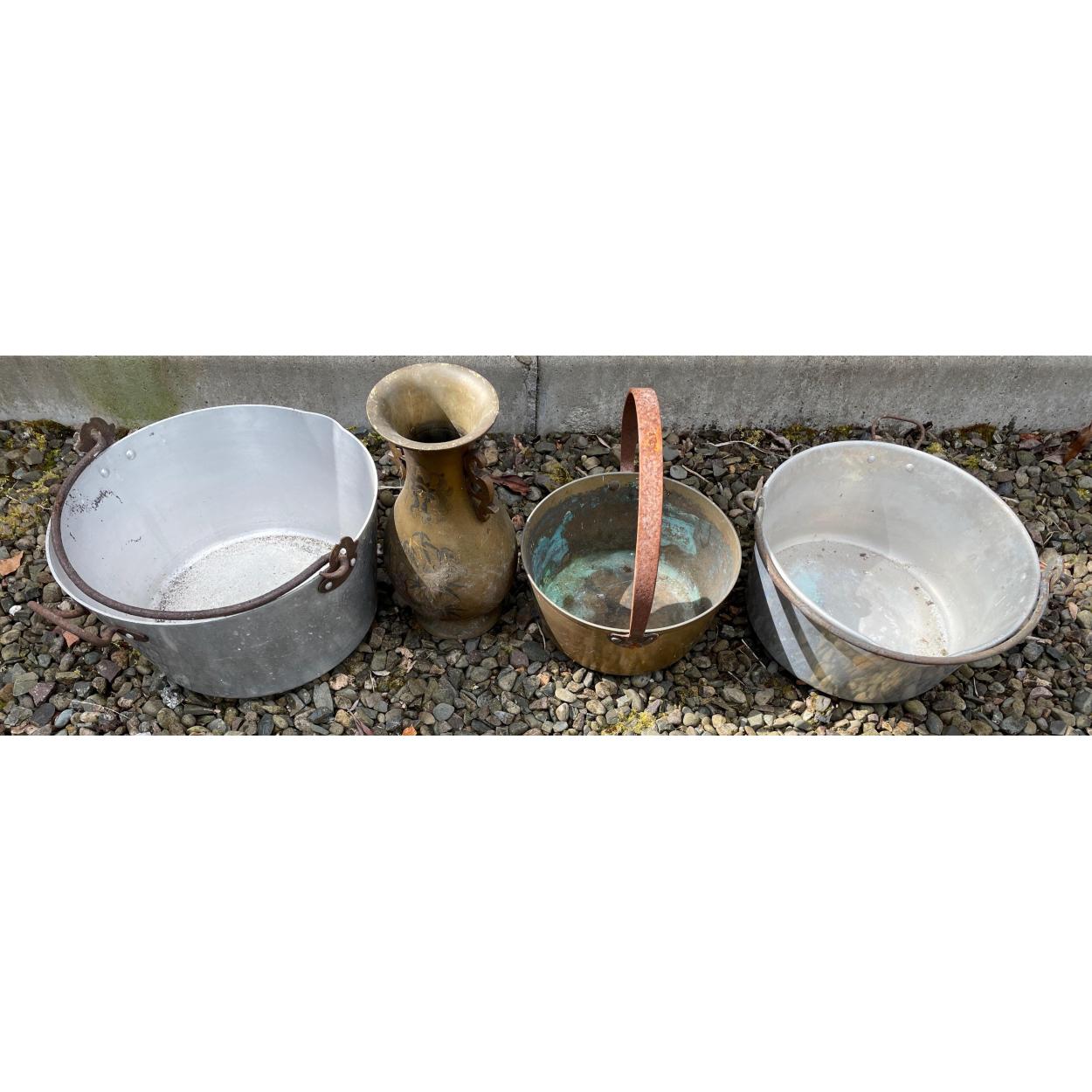 A collection of three VINTAGE jelly pans largest diameter 30cm one brass and two aluminium with a brass style vase 30cm height