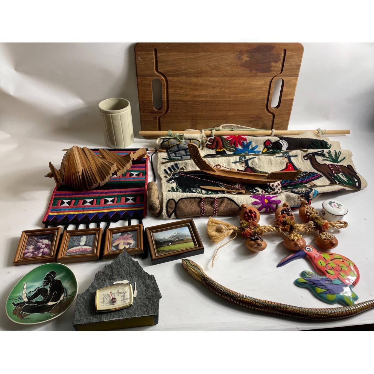 A MIXED BOX to include a SCARY LIFE-LIKE SNAKE, a SLATE THERMOMETER a large CHOPPING WOODEN BOARD, a LIDDED RHS TRINKET BOX (6cm dia), wall hangings etc.