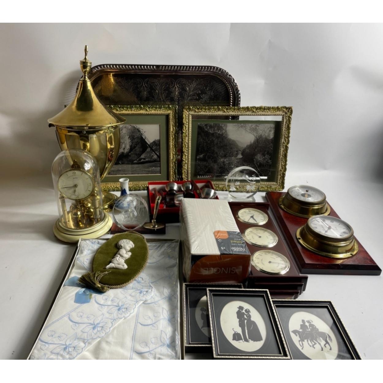 A QUALITY very mixed box to include embroidered pillowcases, single bed sheet (unopened), wall barometer, vases, mantlepiece pendulum clock etc etc