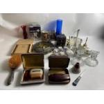 A mixed box to include a COALPORT EGG-SHAPED trinket box, candlesticks, a ceramic Christmas mug, EPNS backed hairbrush and much else besides.