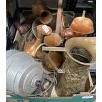 A mixed box to include lots of copper items - pots, decorative jars etc plus a vintage PEARL ALUMINIUM BISCUIT BARREL and an old FLAT IRON.