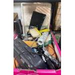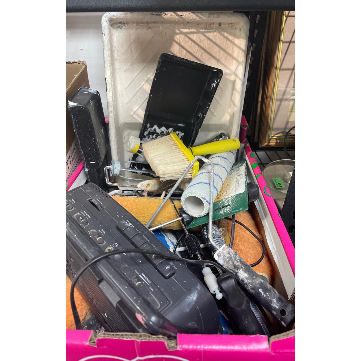 The home decorator's lot - a mixed box of paint trays etc including the obligatory paint-splashed radio.
