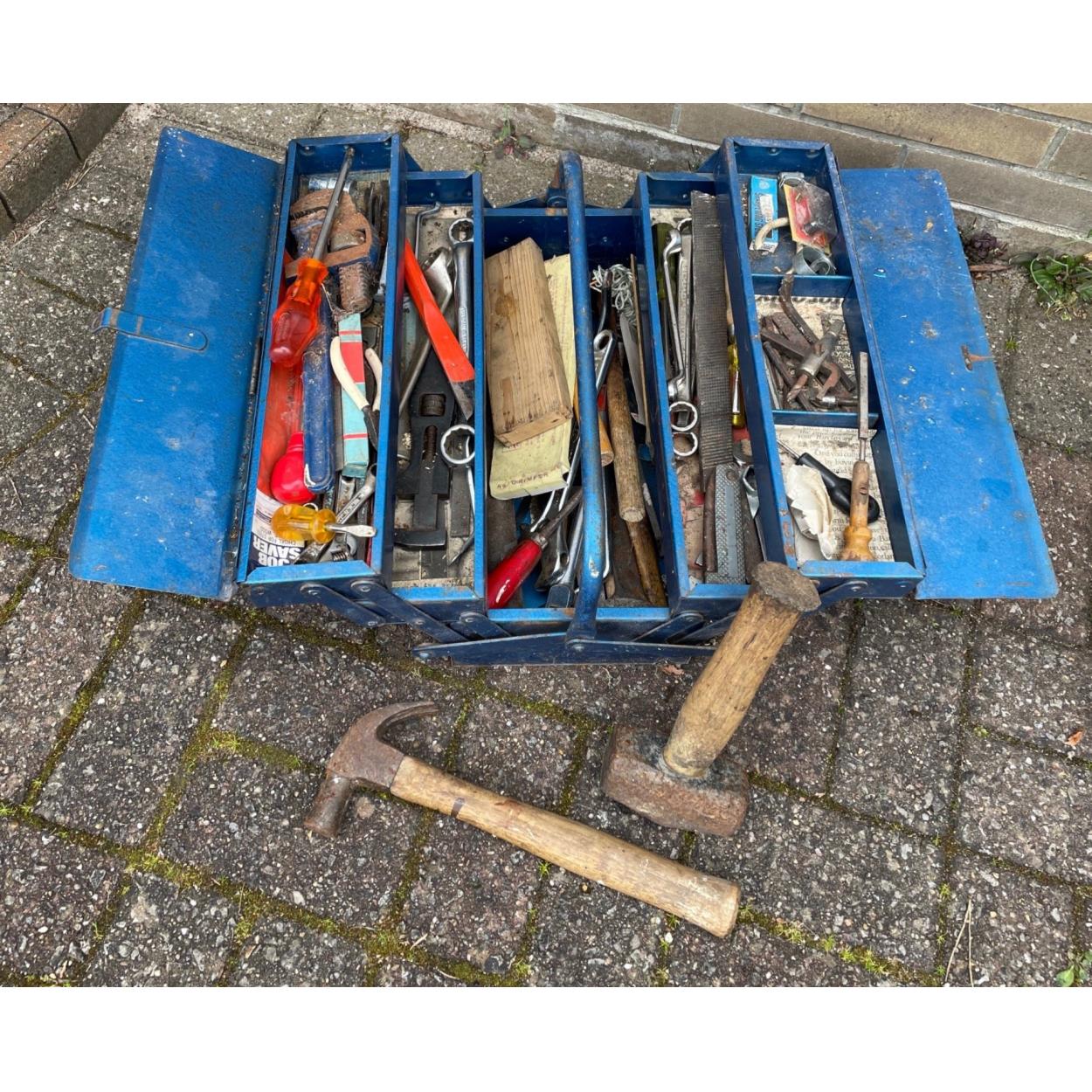 A VINTAGE concertina folding tool box FILLED with tools etc with a couple of hammers
