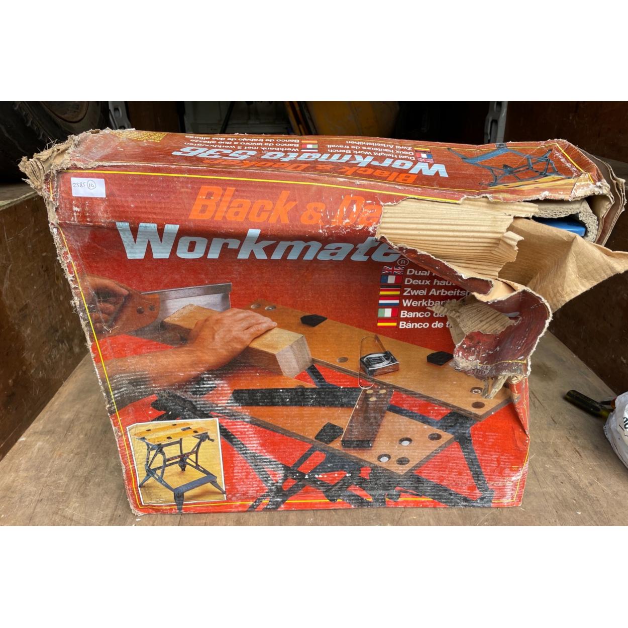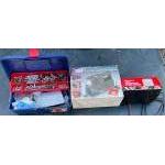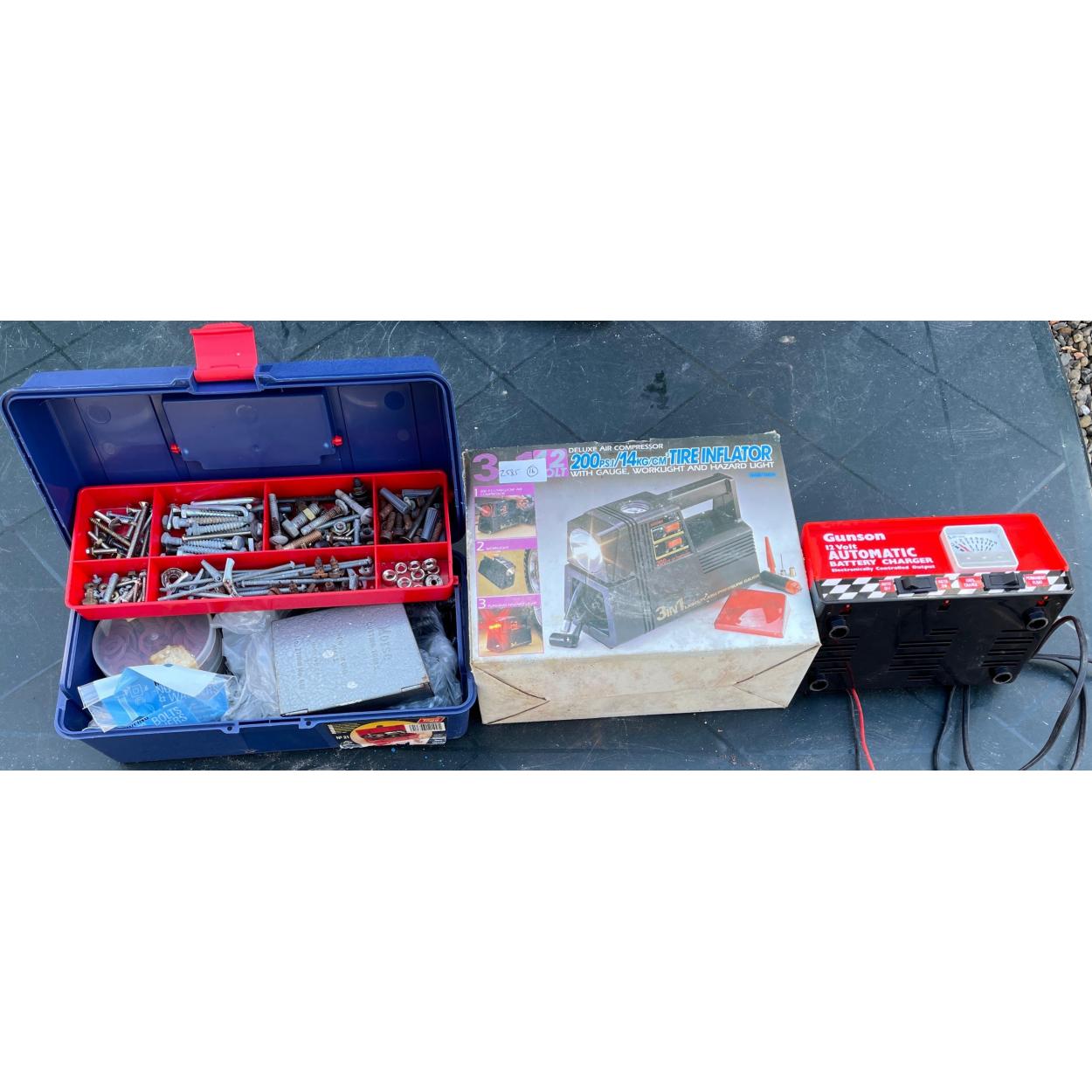 Collection of tools to include an electric battery charger also a 3 in 1 tyre inflator still in its box also a small tool box with an assortment of bolts and drill bits etc
