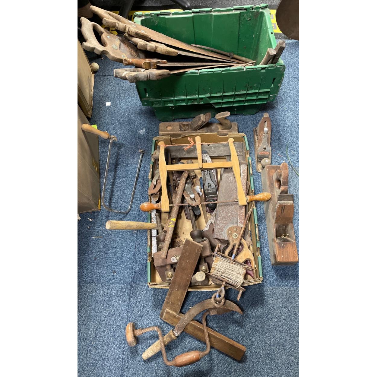 A very mixed box of VINTAGE HAND TOOLS, mainly for the carpentry trade to include, fret saws, hammers, various planes, saws etc.