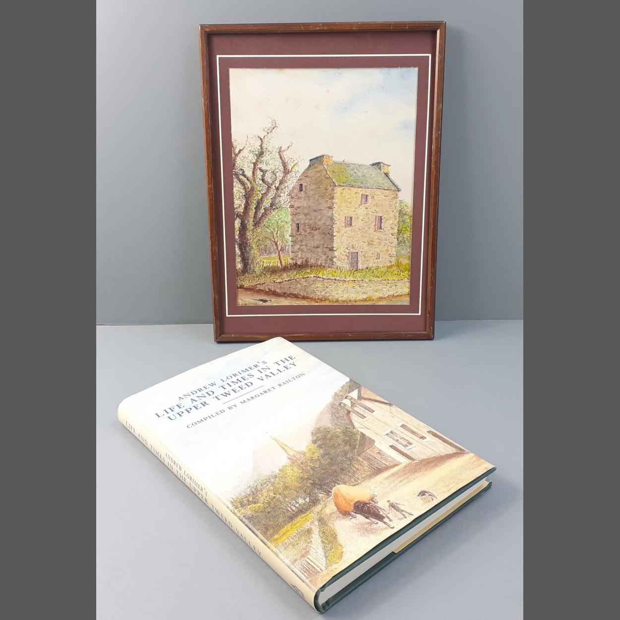PEEBLES INTEEST - Local worthy and artist ANDREW LORIMER interest. A hardcover LIFE AND TIMES IN THE UPPER TWEED VALLEY along with an original water colour by Andrew (unsigned) of Barns Tower near Peebles. Frame measures 29cm x 21cm approx. In very good condition. A lovely group of local interest.