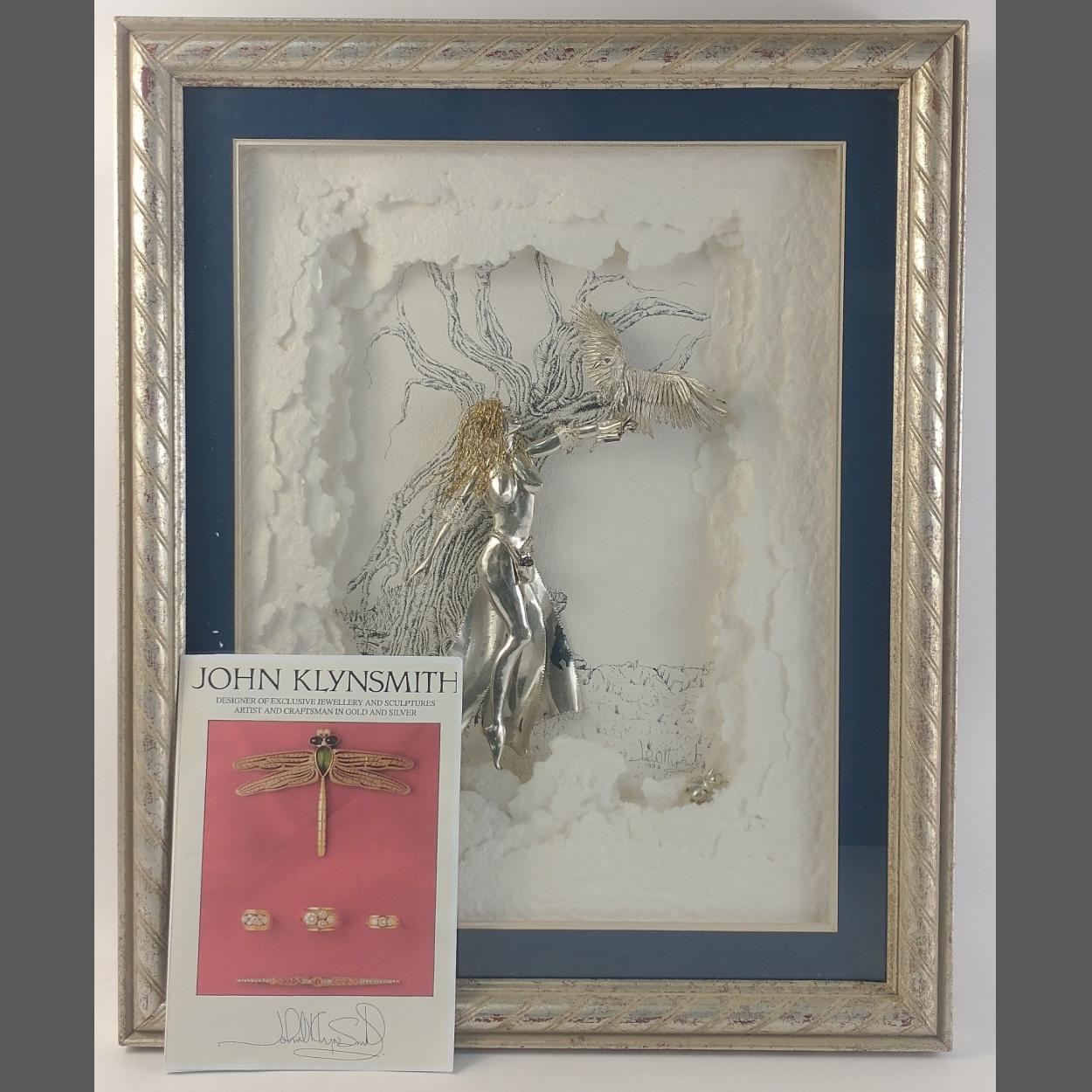 JOHN KLYNSMITH Galadriel & Thorondor from TOLKEIN Lord of the Rings. A magnificent exclusive original art piece in handmade paper. Pure silver & 18ct gold from 1998 by renowned South African jeweller and artist John Klynsmith. Frame measures 53cm x 44cm approx. A rare opportunity to acquire an original piece by this collectible artist.