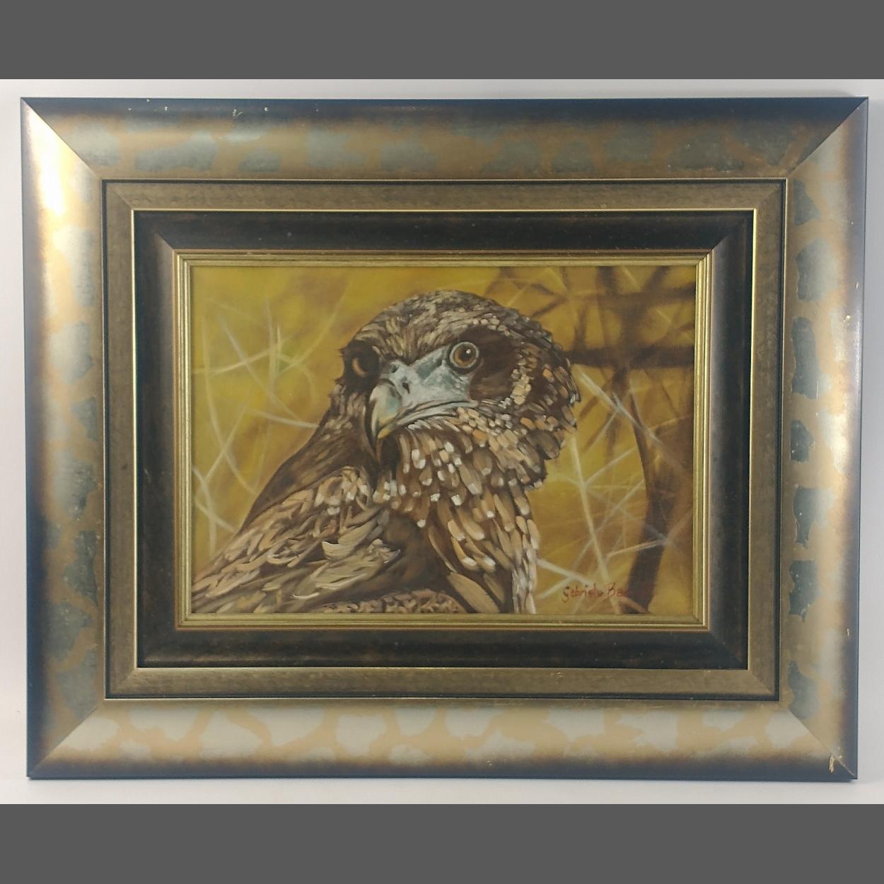 GABRIELE BARNETT An original wildlife art piece by this accomplished South African born, Scottish Borders based artist. Lovely study of Eagle Head oil on canvas. Sympathetically framed. Measures 57cm x 46cm approx.