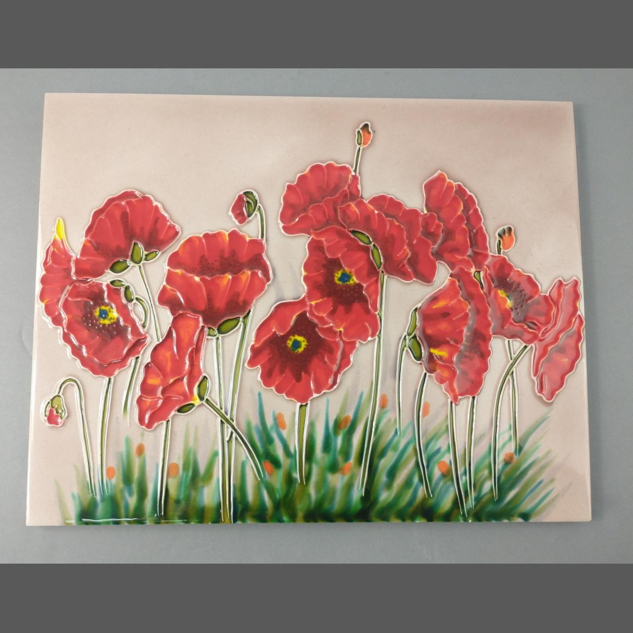 A wonderful ceramic plaque mounted with a stand with a beautiful and colourful poppy scene 35x28cm approx