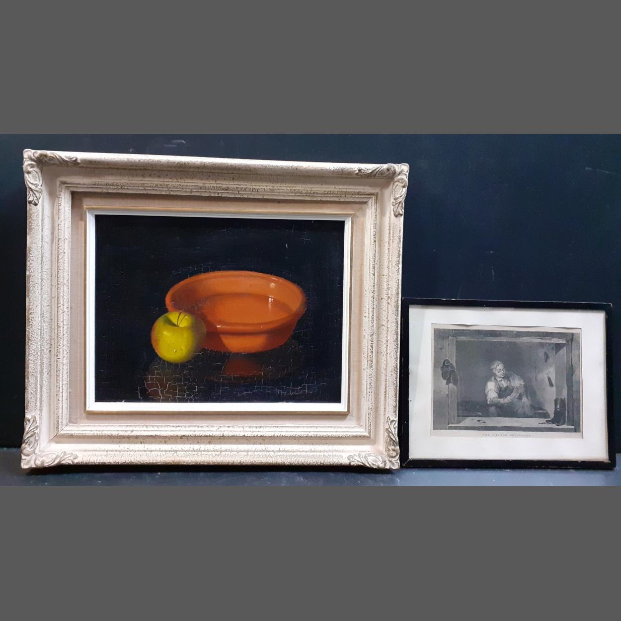 An oil on canvas still life. No visible signature. Frame size 49 x 40cm approx. Visible work 33 x26cm approx Some crackling to surface. Plus a print of The Village Politician by H LIVERSEEGE 1829. Frame size 30 x 23cm approx