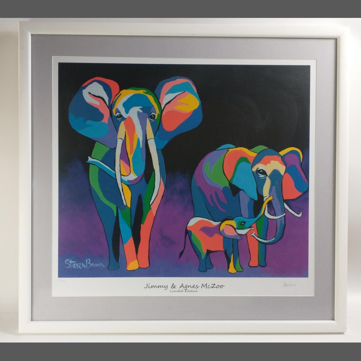 A JIMMY & AGNES McZOO limited edition (69/295) by STEVEN BROWN showing a colourful elephant family.