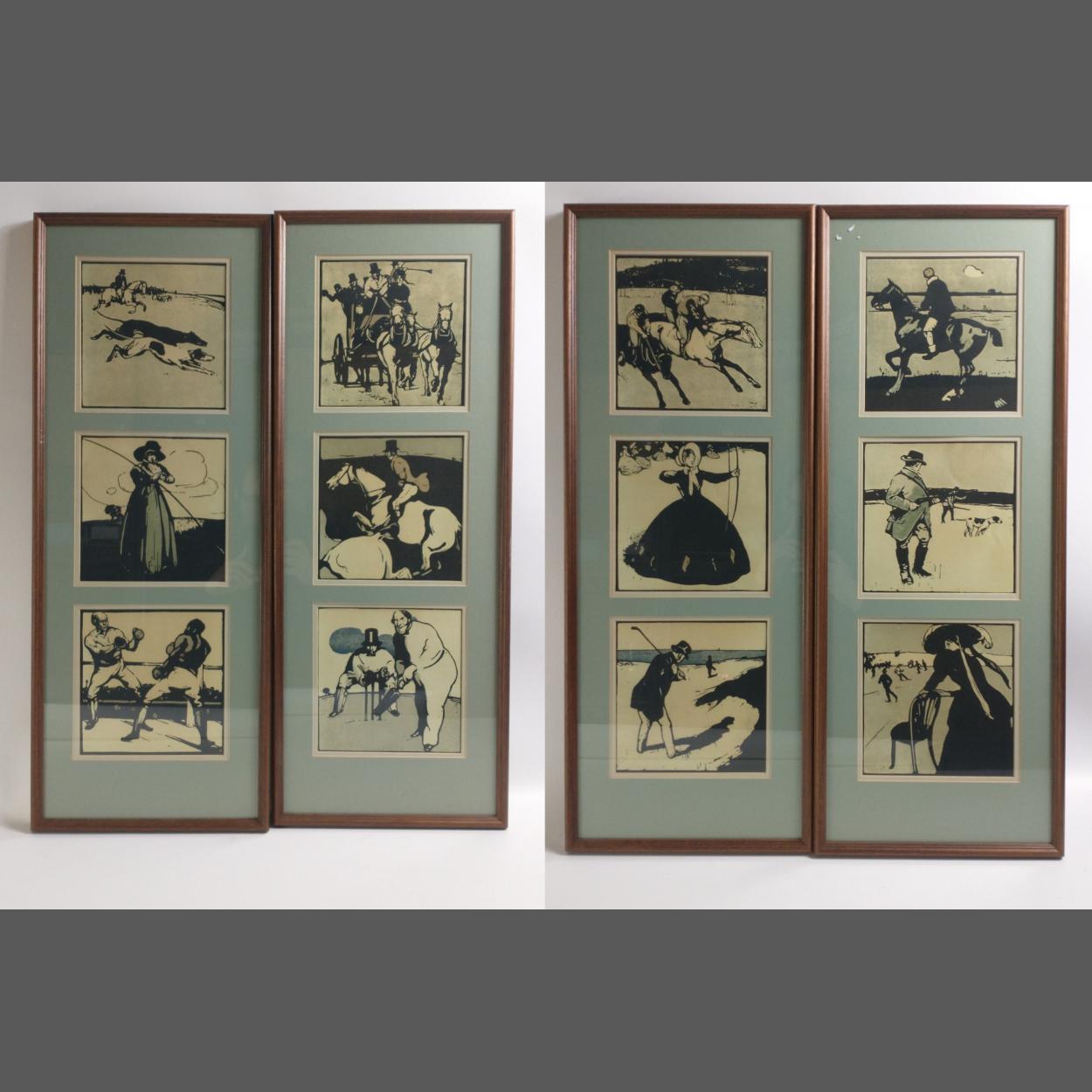Four framed triptych black and white prints of old sporting themes to include archery, hunting, fishing, boxing etc. Each frame measures 82 x 32cm approx. Well framed in good condition.