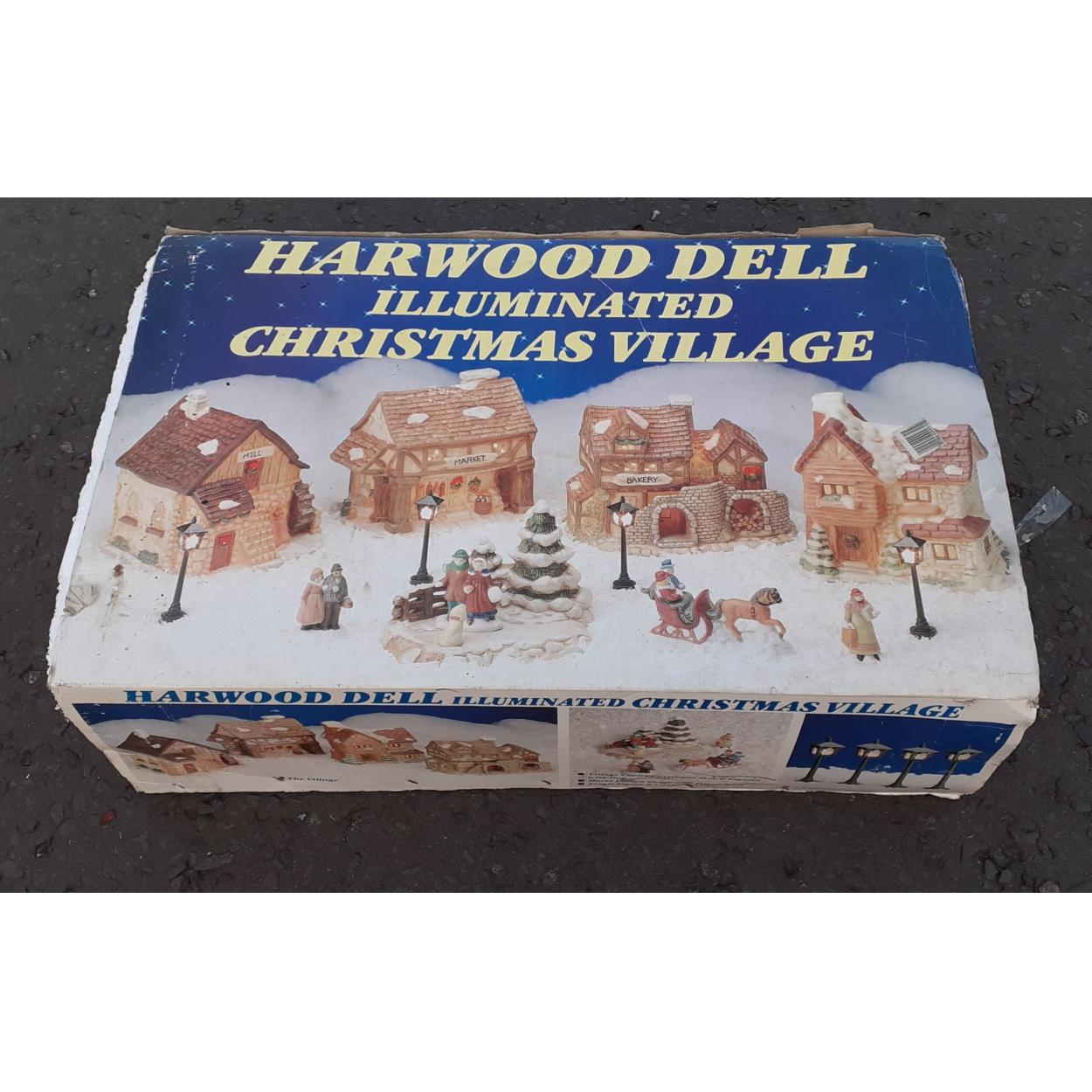 Christmas diorama. HARWOOD VILLAGE illuminated Christmas Village. Used in original box. Missing street lamps.