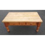 A low level wooden coffee table with 3 storage drawers, measuring 120 x 70 x 50cm approx. Needs re-finishing.