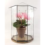An octagonal glass terrarium with silk cyclamen plant. Stands 35cm tall approx.