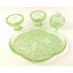 Green glass dressing table set with floral and butterfly embossed design to include a tray (approx 31x23cm), 2 ring tray (approx 8cm tall) and a trinket dish (approx 11cm tall). Possibly uranium glass but not tested