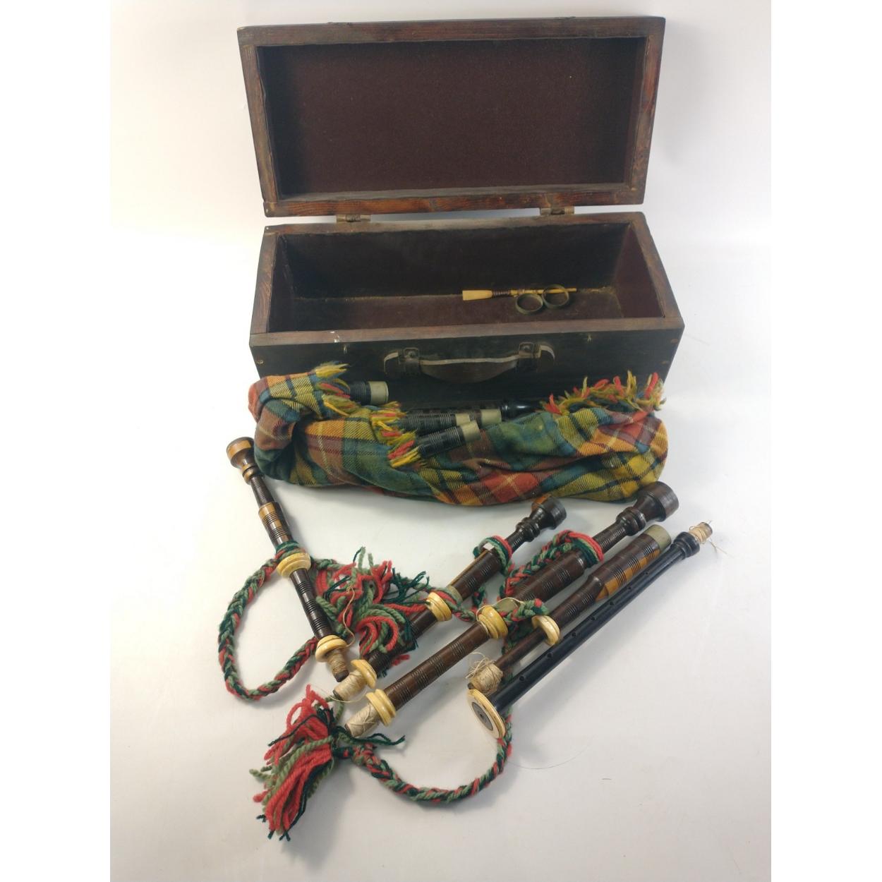 A very scarce set of 1930s half size or child's size BAGPIPES. Edinburgh stamp to chanter. Some wear from use and long term storage, bag appears to be original. A super little set and a great survivor.