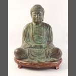 A heavy hollow cast metal BUDDHA on wooden base. Attractively modelled with patinated green finish. Stands 29cm approx.