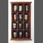 A set of 12 vintage Chinese Cloisonne Pots (8cm approx) with individual stands all in a wooden display unit (51 x 28cm approx).