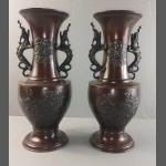 A pair of bronze Oriental vases with dragon handles, each 31cm tall approx.