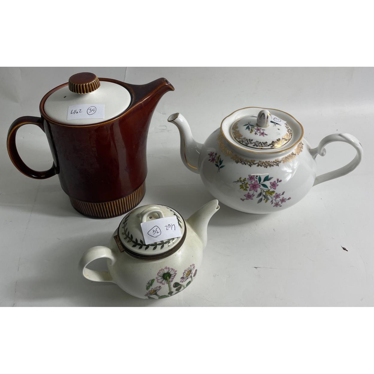 A selection of 2 teapots and one coffee pot to include a brown POOLE coffee pot 18cm tall, and a SMALL PORTMEIRION BOTANIC GARDENS 25th ANNIVERSARY designed by SUSAN WILLIAMS-ELLIS 9cm tall x 15cm widest point approx and lastly a VINTAGE ROYAL GRAFTON fine bone china floral decorated teapot!