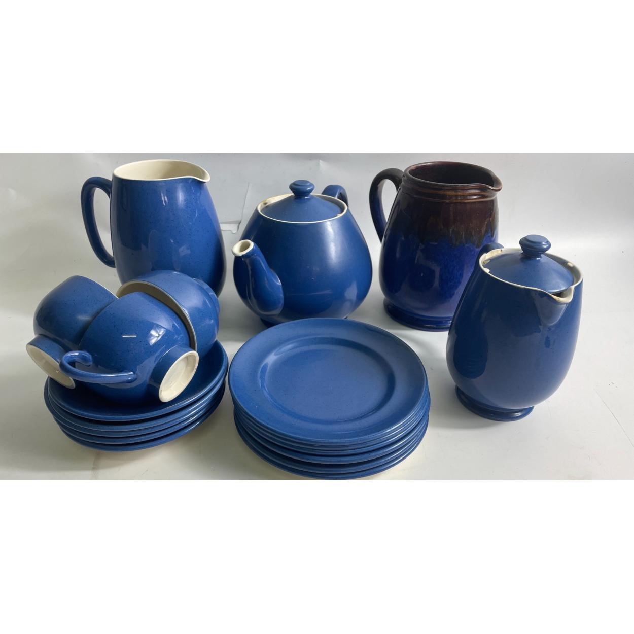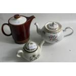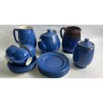 A part 3 cup teaser with teapot and jug and milk jug with lid (small chip on outer rim!) and one other VINTAGE BLUE AND BROWN 16cm tall etc