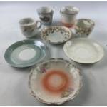 Collection of MOUSTACHE CUPS with saucers, floral bunting style by Park Place, luster sea green marked made in Germany, gold banded marked 'From a friend' and peach based with gilt highlights