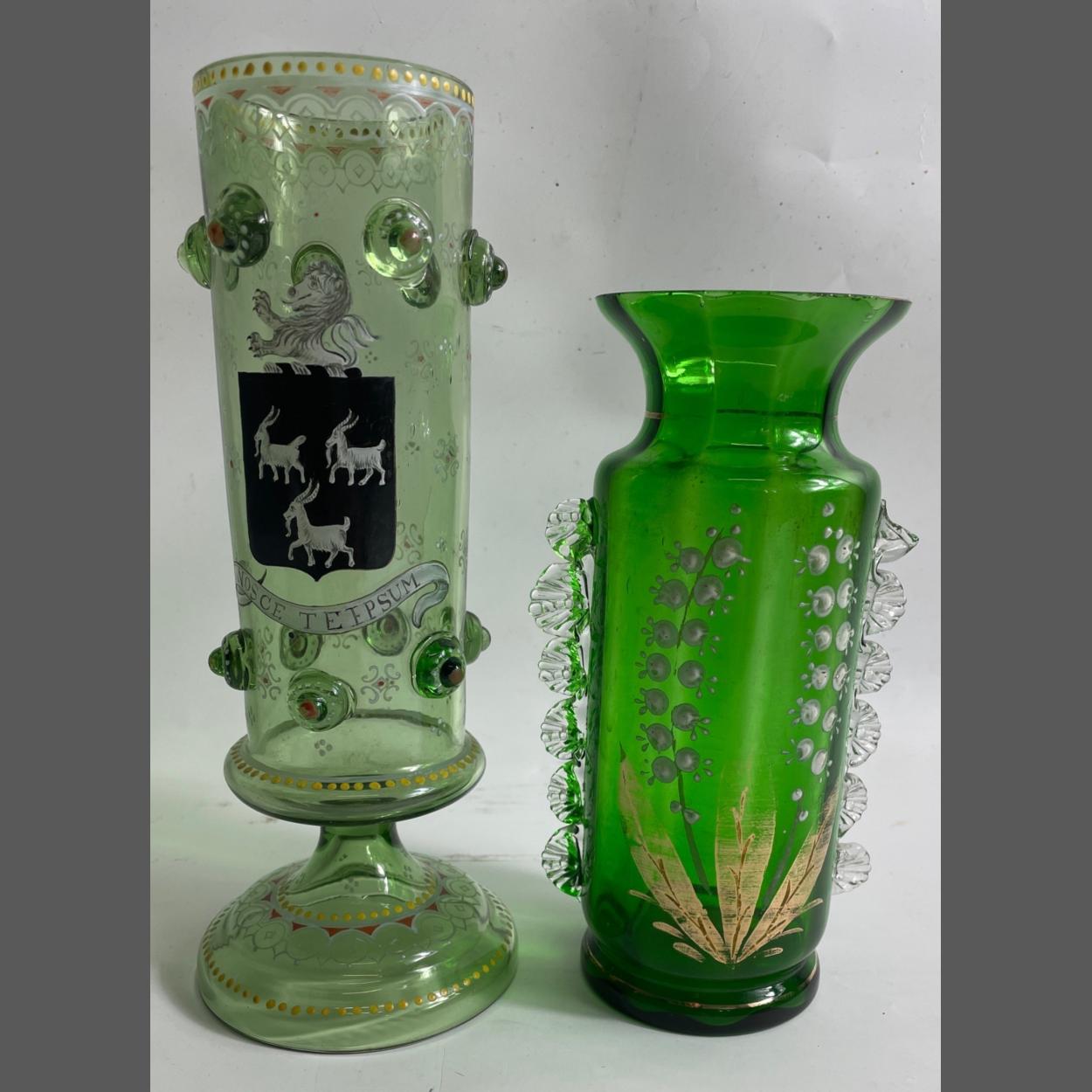Two VINTAGE green hand-painted vases, the first with lily-of-the-valley (18cm high, one small chip), the other 22cm high with heraldic device of shield with black background with 3 goats and lion rampant and motto NOSCE TEIPSUM.