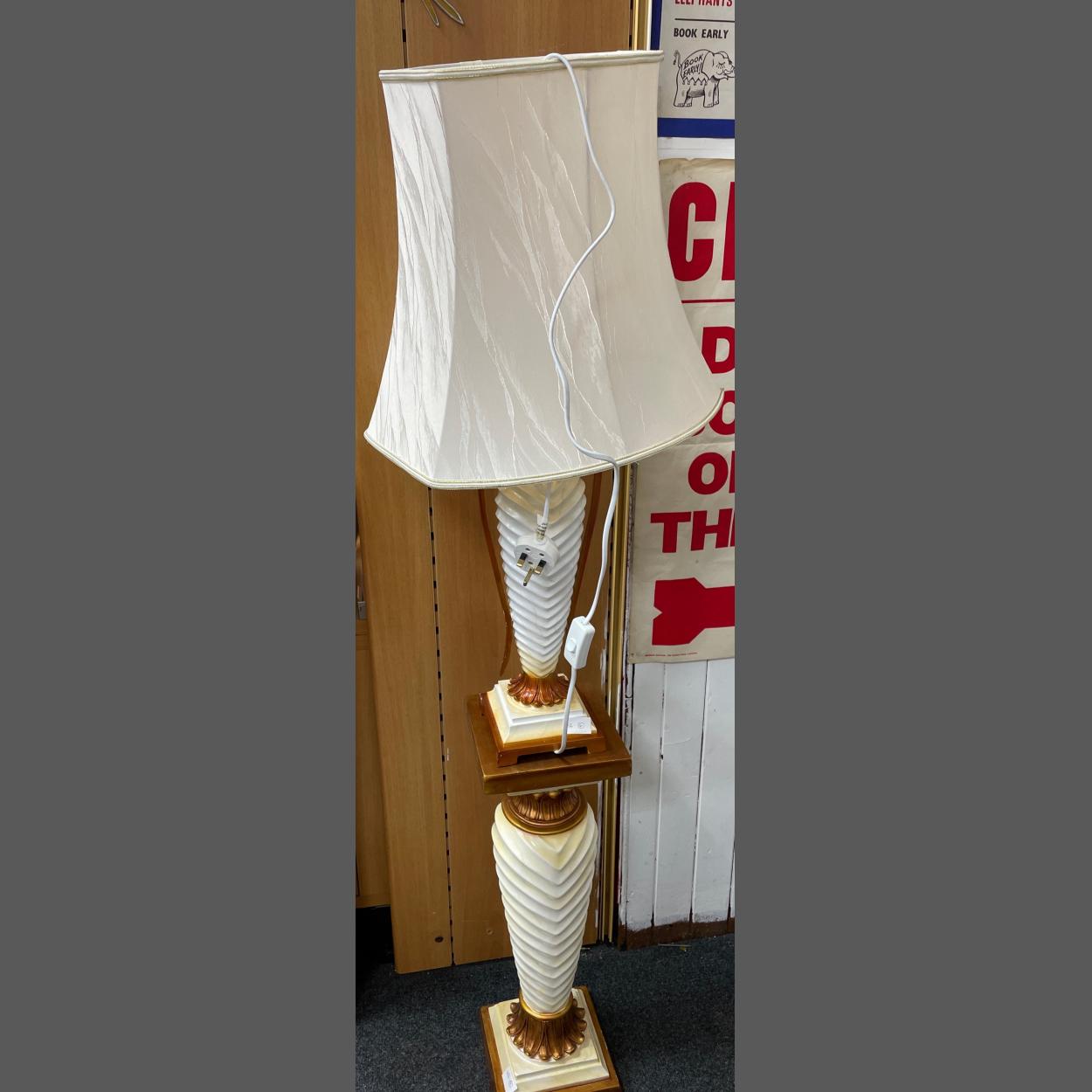 A statement piece TABLE LAMP and plinth with pearlescent finish and burnt orange decorative details, combined height from top of shade to base of plinth approx 143cm