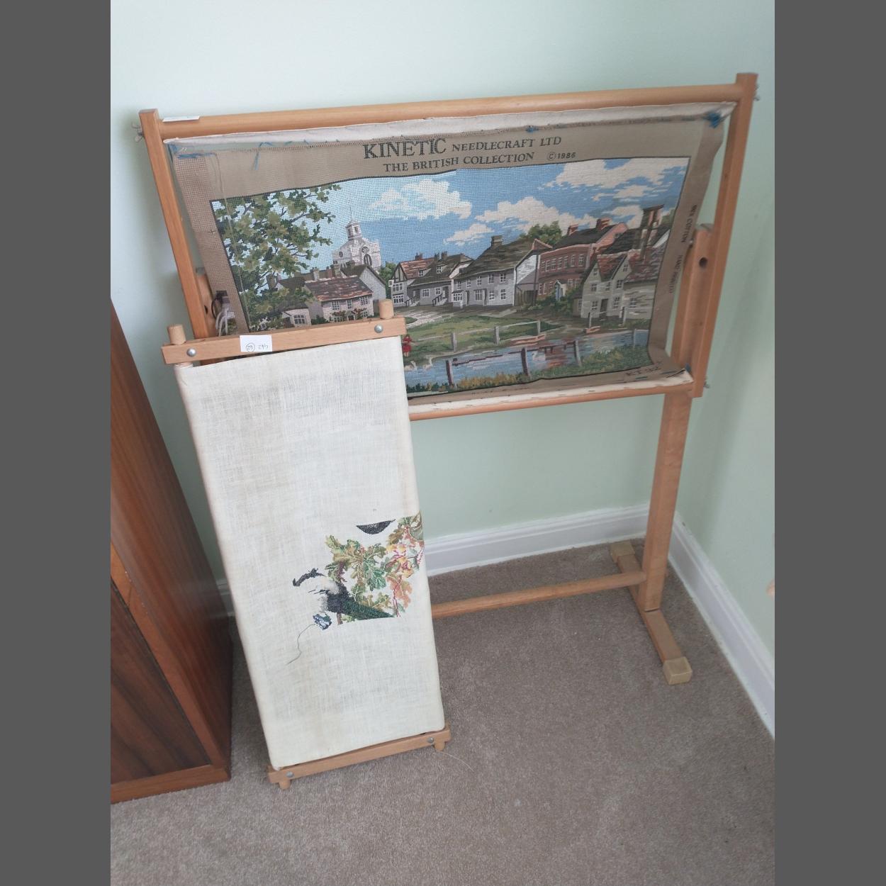 A needlecraft frame with a KINETIC canvas and wools 97cm high x 72cm long x 47cm high( canvas dimensions) with an additional canvas and wooden frame stretcher 78cm x 31cm