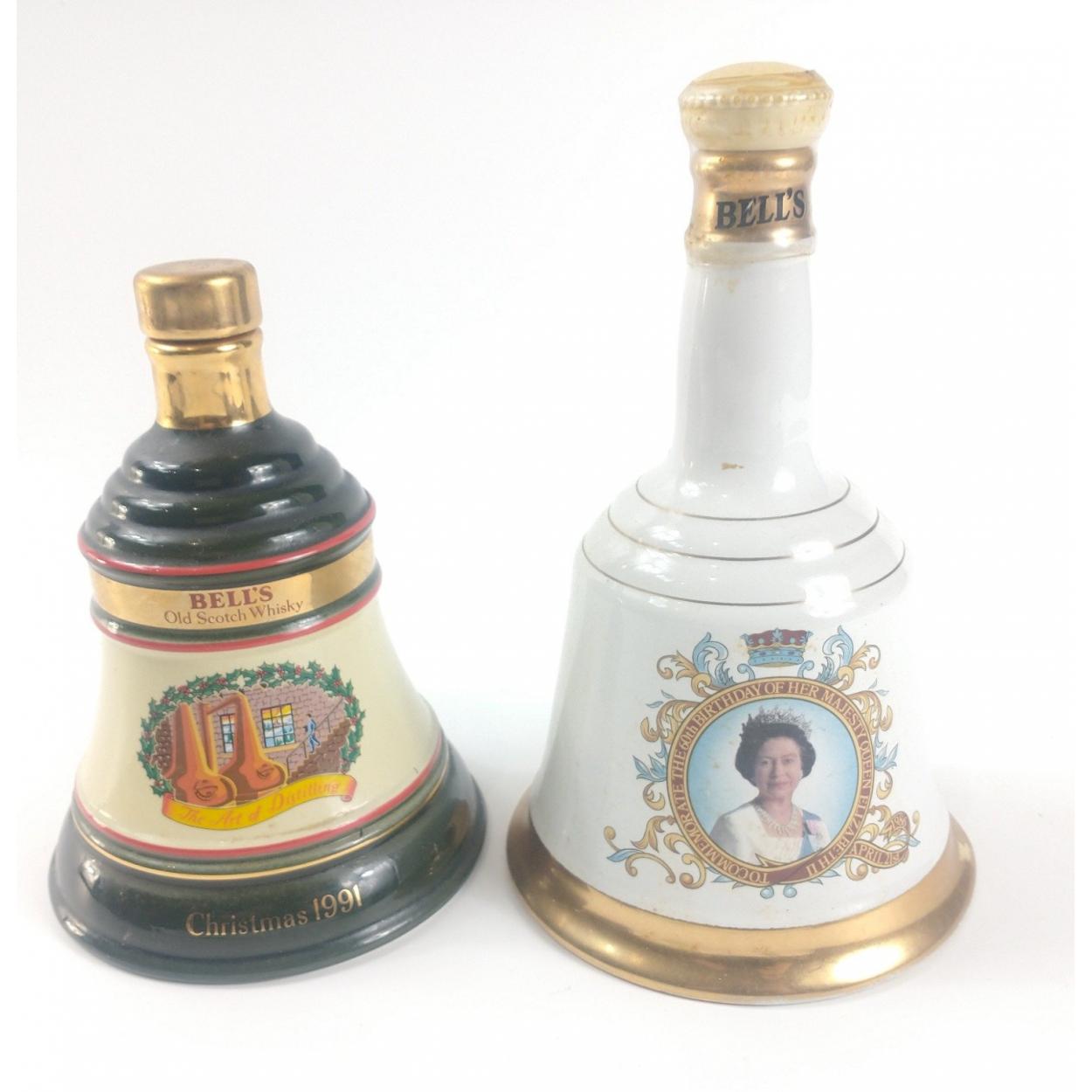 A 1986 Bells Commemorative Decanter for the Queen's 60th birthday in sealed condition. One other empty decanter from Christmas 1991.