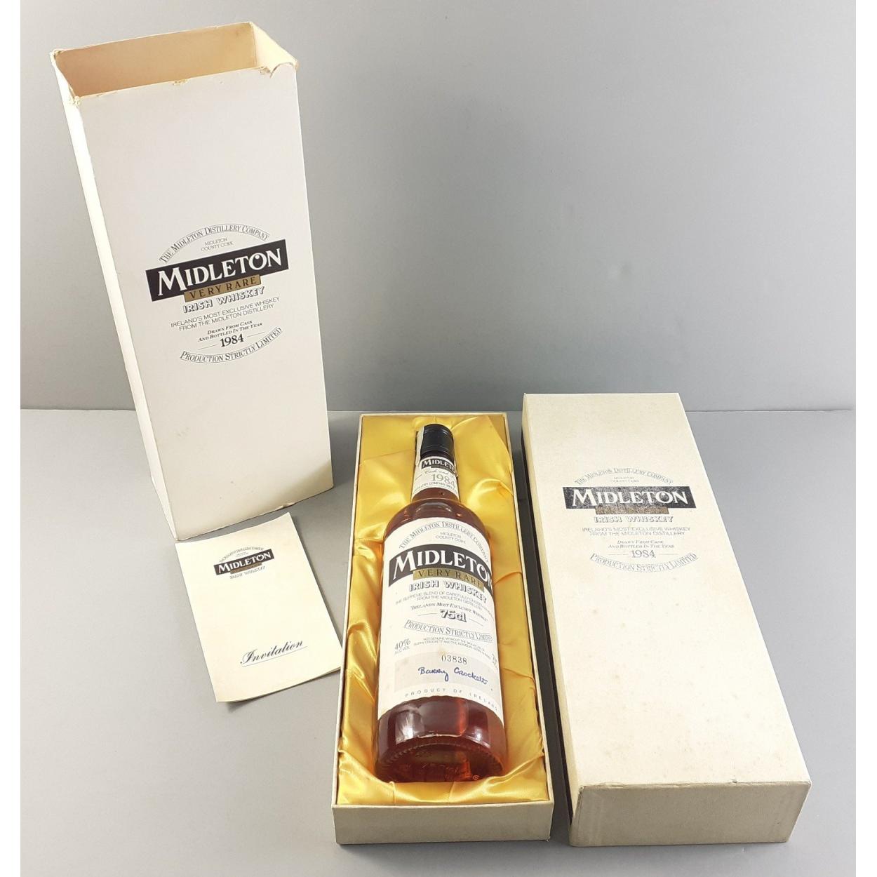 IRISH MIDLETON VERY RARE 1984 IRISH WHISKEY BLEND 75cl - production strictly limited - Barry Crockett No 03838 - still in original presentation case and outer sleeve, a little worn, - it also comes with an invitation leaflet card with bottle No 3838 and the certificate of authenticity. Bottle seal intact with original distillery bottling paper seal - no angels share evident and whisky level correct