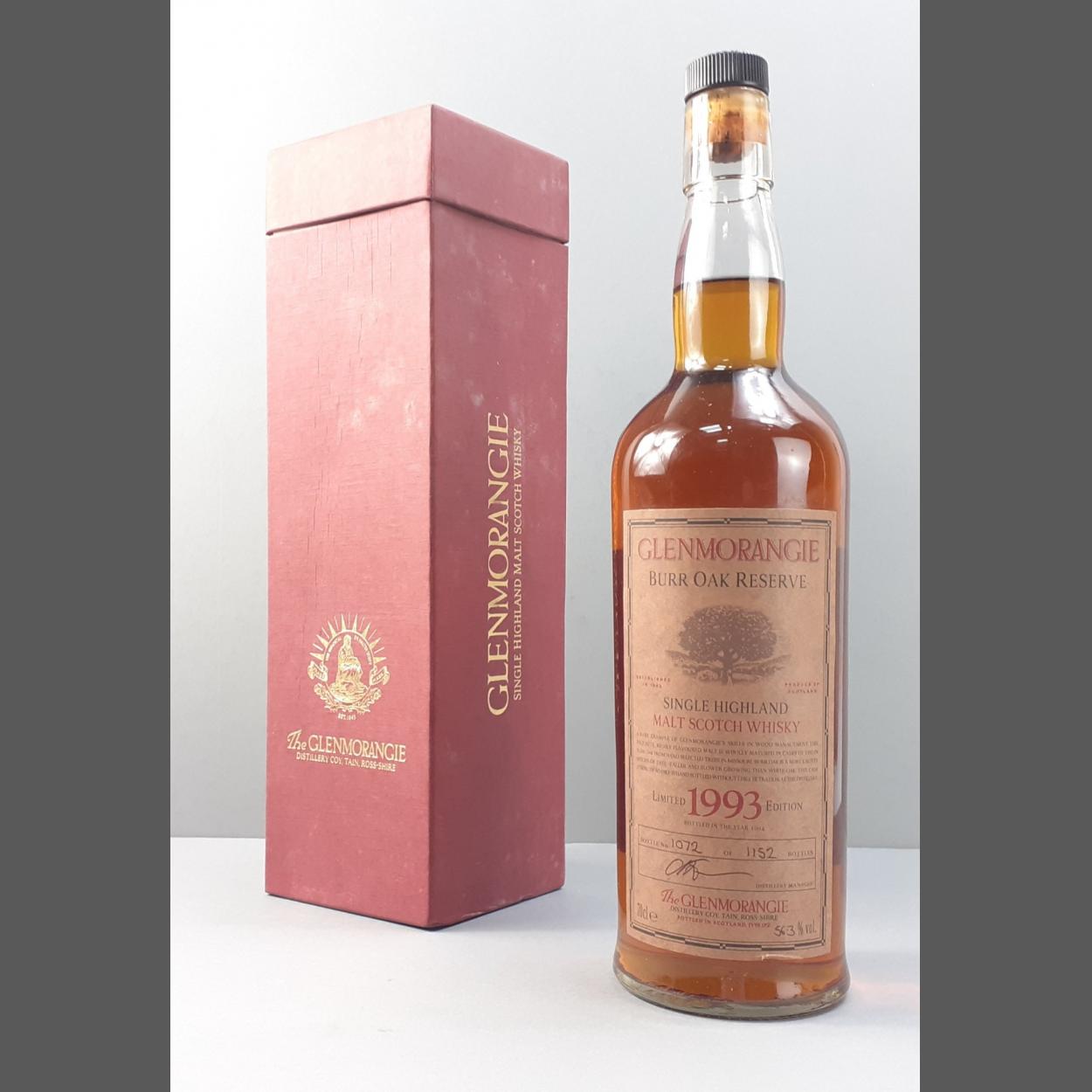 A boxed 70cl bottle of 1993 GLENMORANGIE Burr Oak Reserve single Highland malt whisky being bottle 1072 of 1152 signed by the distillery manager. An impressive 56.3% vol.
