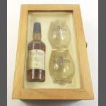 A wooden presentation display case comprising 1 x 20cl bottle of TALISKER single malt and 2 Talisker labelled whisky tumblers