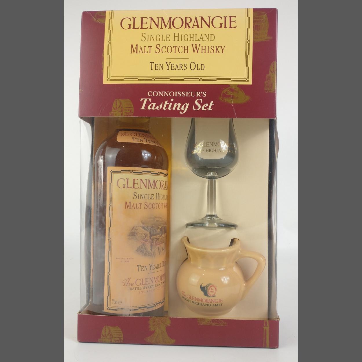 A GLENMORANGIE 10 year old connoisseurs tasting set comprising a70cl bottle, inscribed glass and small water jug