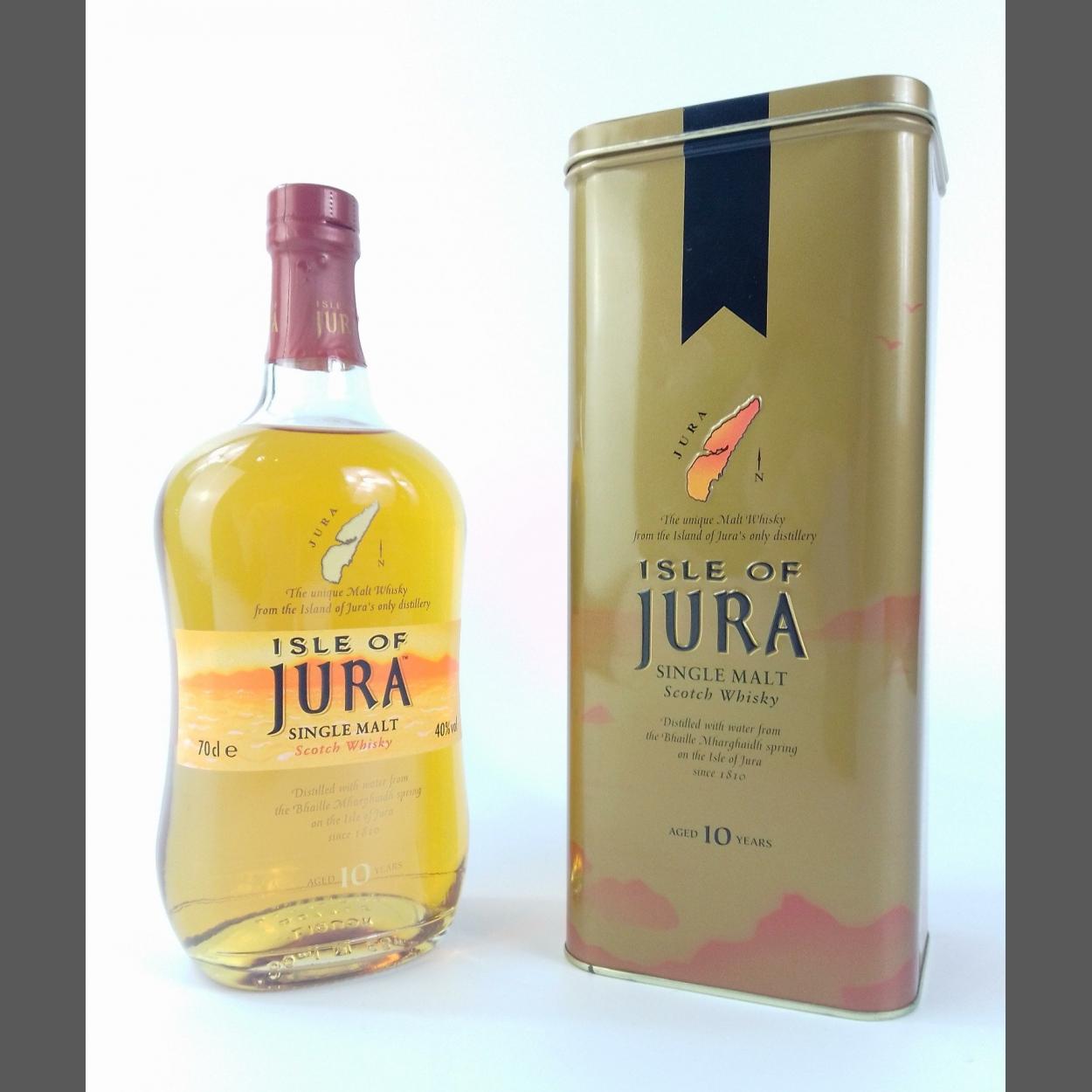 An ISLE OF JURA 10 year old malt whisky in a tin, 70cl
