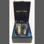 A presentation box with sealed 75cl black ceramic flagon of QE2 Highland malt whisky made by Morrison Bowmore Ltd