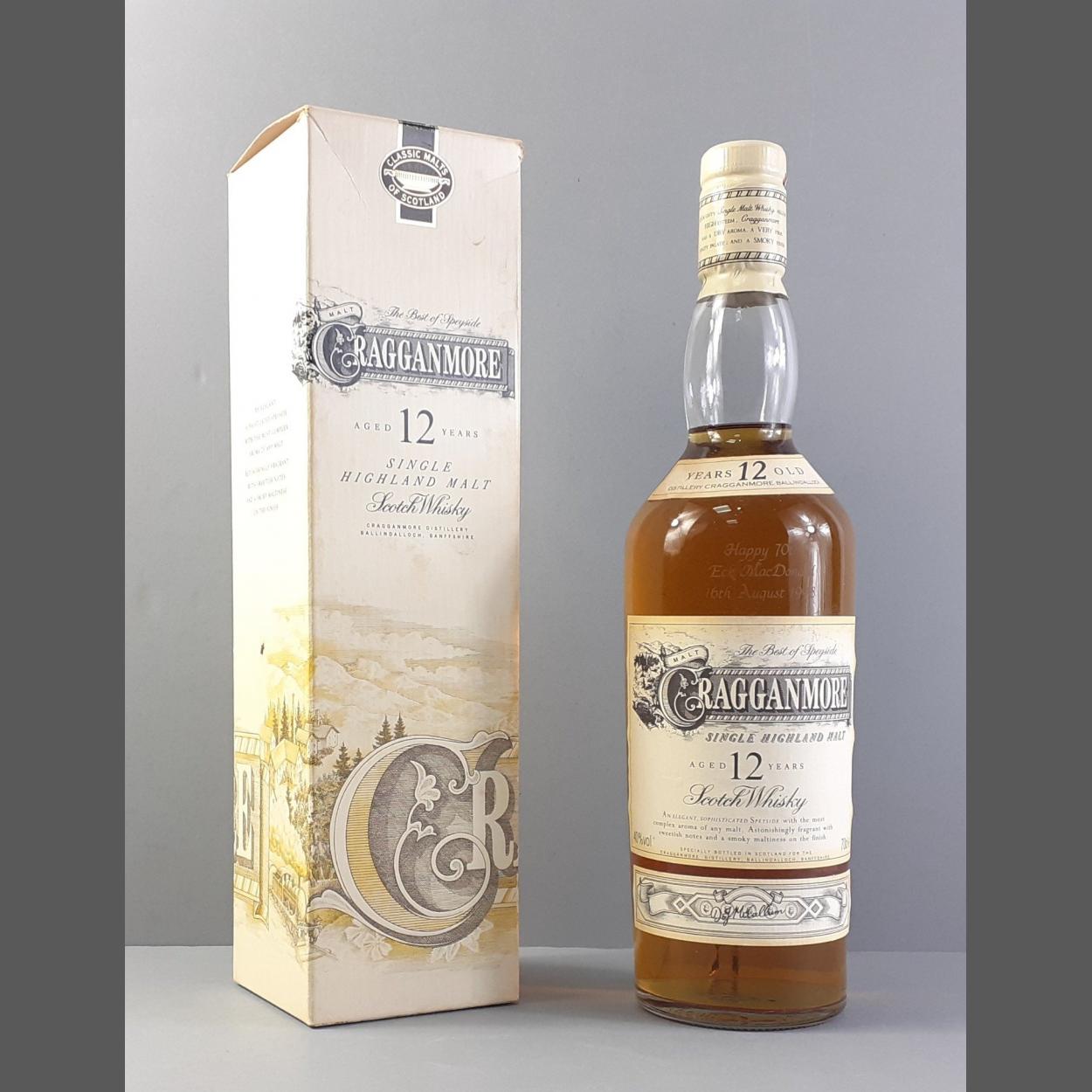 CRAGGANMORE 12 year old Single Highland Malt in box. 70cl in excellent condition. This was a 70th Birthday presentation bottle to the vendor's father in 1998 and the bottle is lightly engraved accordingly. A touching note on a lovely whisky.