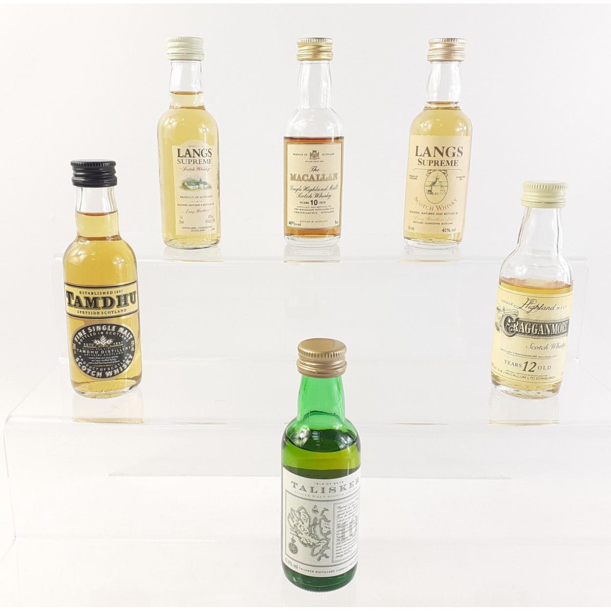 Six single malt whisky miniatures to include MACALLAN 10 years, Tamdhu, Talisker, Cragganmore and two Langs Supreme.
