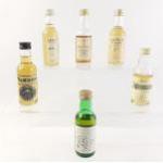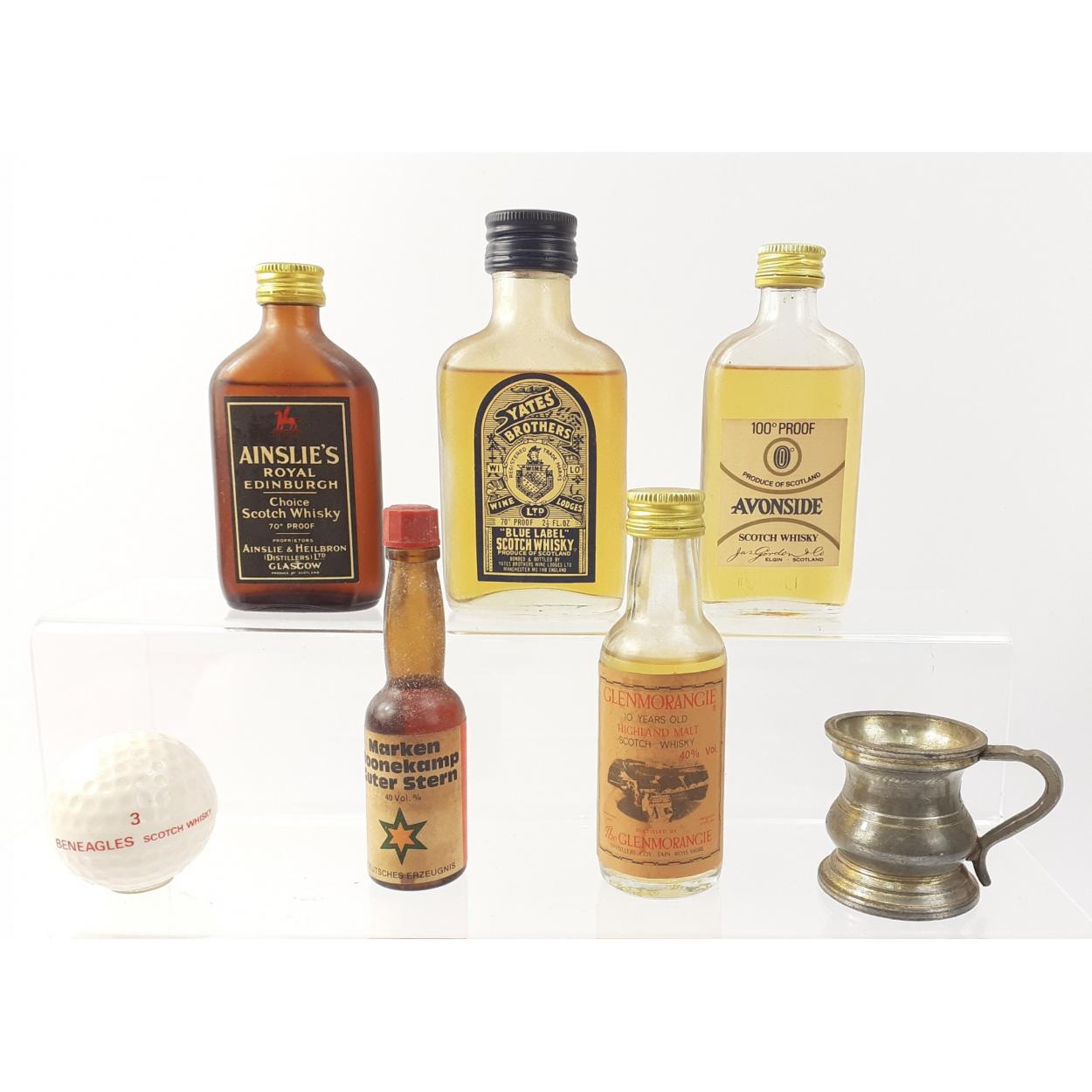 A small whisky miniature lot to include AINSLIE'S ROYAL EDINBURGH whisky, YATES BROTHERS Blue Label, AVONSIDE 100 proof, Glenmorangie 10 year old. Some interesting labels