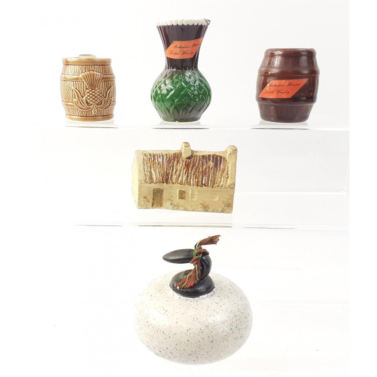 A selection of novelty whisky miniatures to include a BENEAGLES curling stone, PETER THOMSON barrel, RUTHERFORDS vase