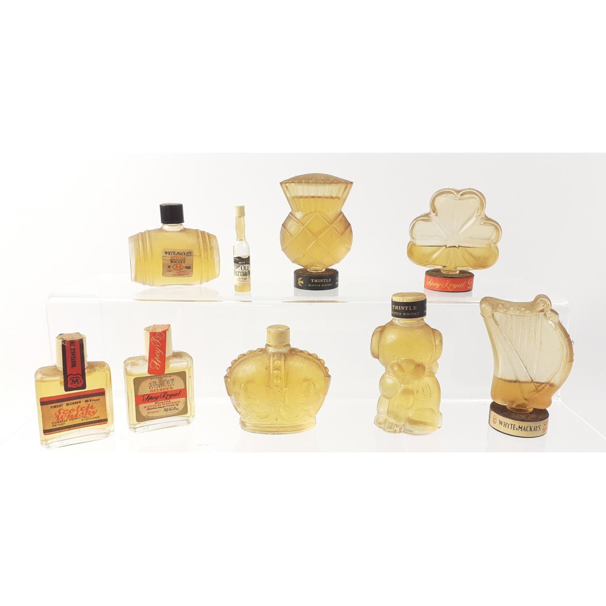 VINTAGE - Novelty shaped whisky miniatures to include a crown, a harp, shamrock, thistle, bear, barrel
