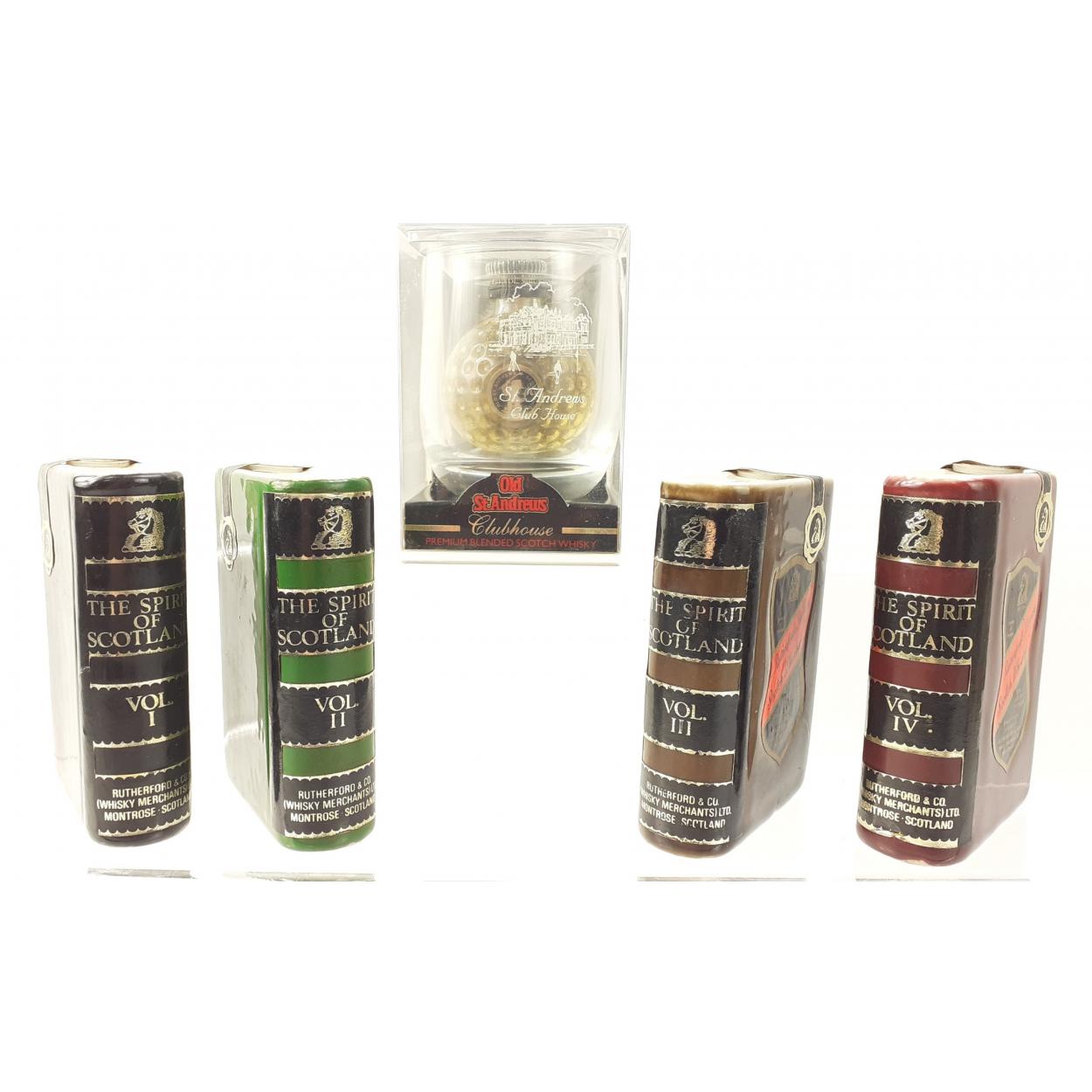Four RUTHERFORD'S Spirit of Scotland book-shaped miniatures with contents and a St Andrews Old Course Clubhouse miniature