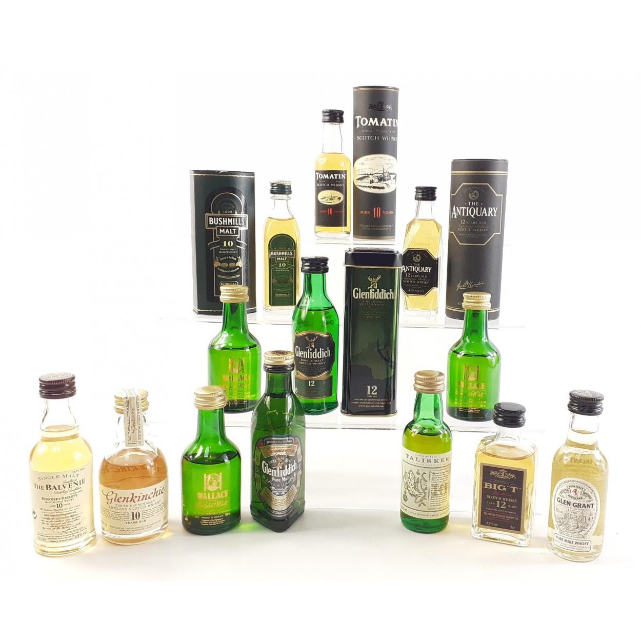 Small collection of 13 whisky miniatures to include Glenfiddich, Tomatin, The Antiquary, Bushmills and others.