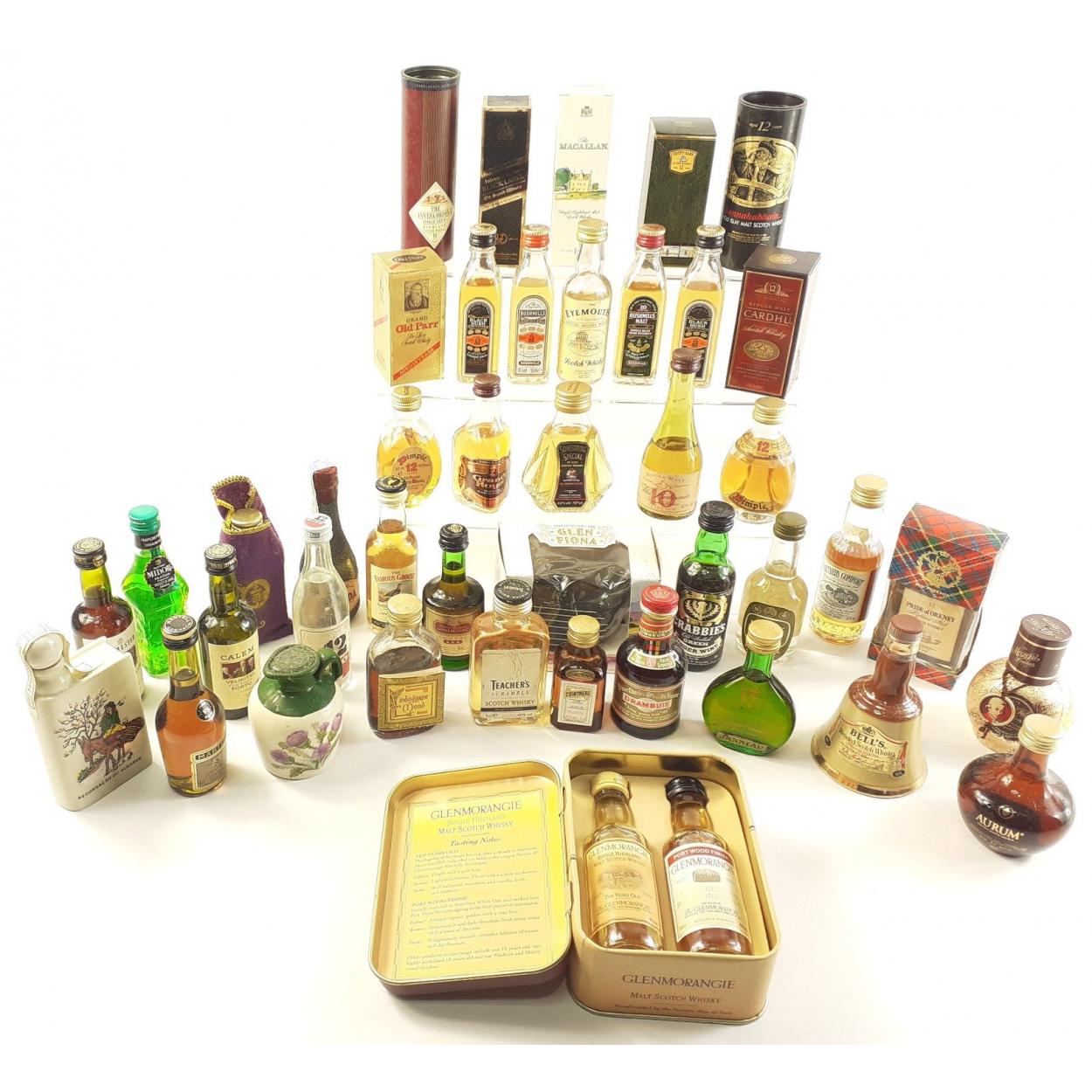 Over 35 super miniatures mainly whisky to include boxed MACALLAN 10 years old, boxed 12 year old CUTTY SARK, boxed CARDHU in shape of gold club, boxed BUNNAHABHAIN, and much else