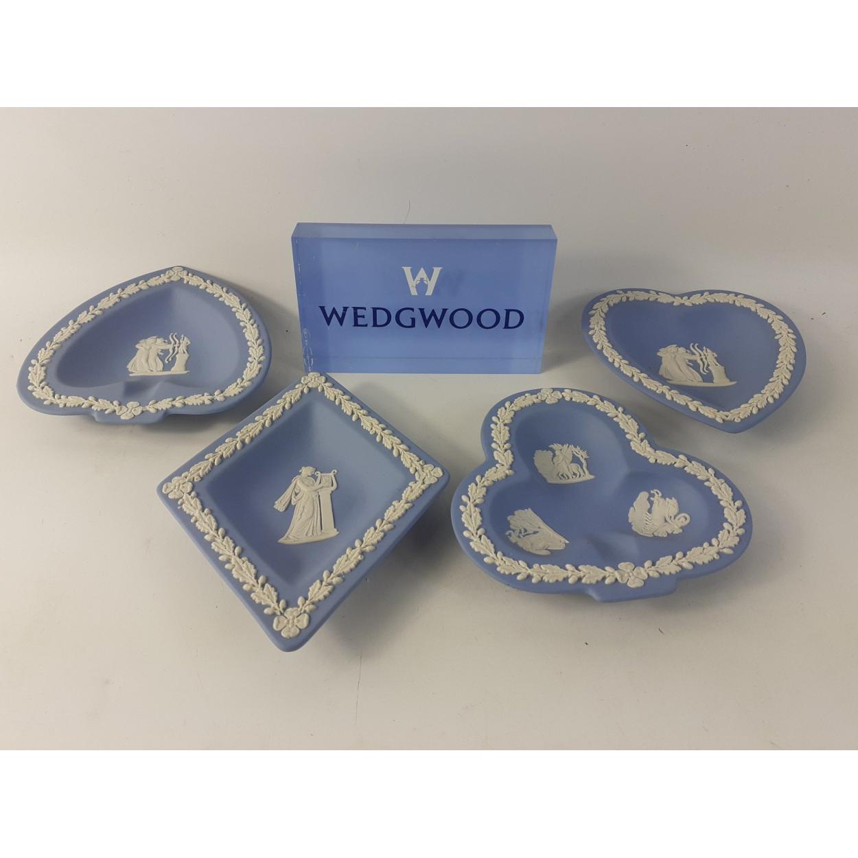 WEDGWOOD A very attractive little collection of four Jasperware trinket dishes with a retailer's display acrylic block. All in good order.