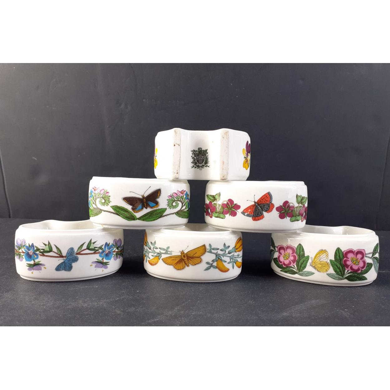 PORTMEIRION Ceramics - A collection of freestanding Botanic Gardens pattern six napkin rings of various designs each 7cm across. All in good order with no damage.