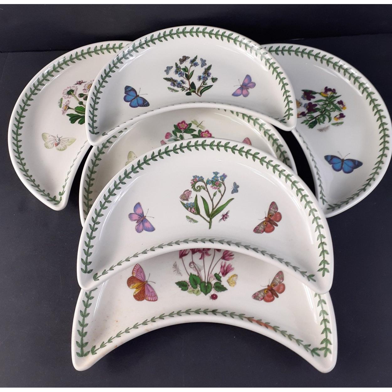 PORTMEIRION Ceramics - A collection of six Botanic Gardens pattern demi-lune dishes of various floral and butterfly designs. Each 23cm across and all in good condition.