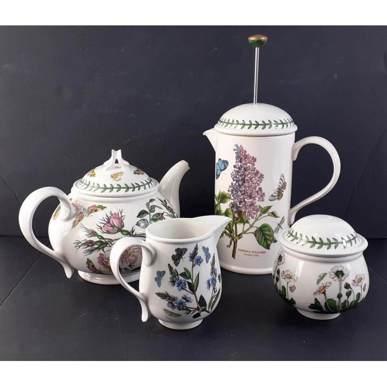 PORTMEIRION Ceramics - A collection of Botanic Gardens pattern tea ware to include teapot, coffee pot / cafetiere, sugar & cream. Various floral designs , coffee pot stands 23cm tall. Teapot has damage to spout and to handle, milk jug has a minor chip.
